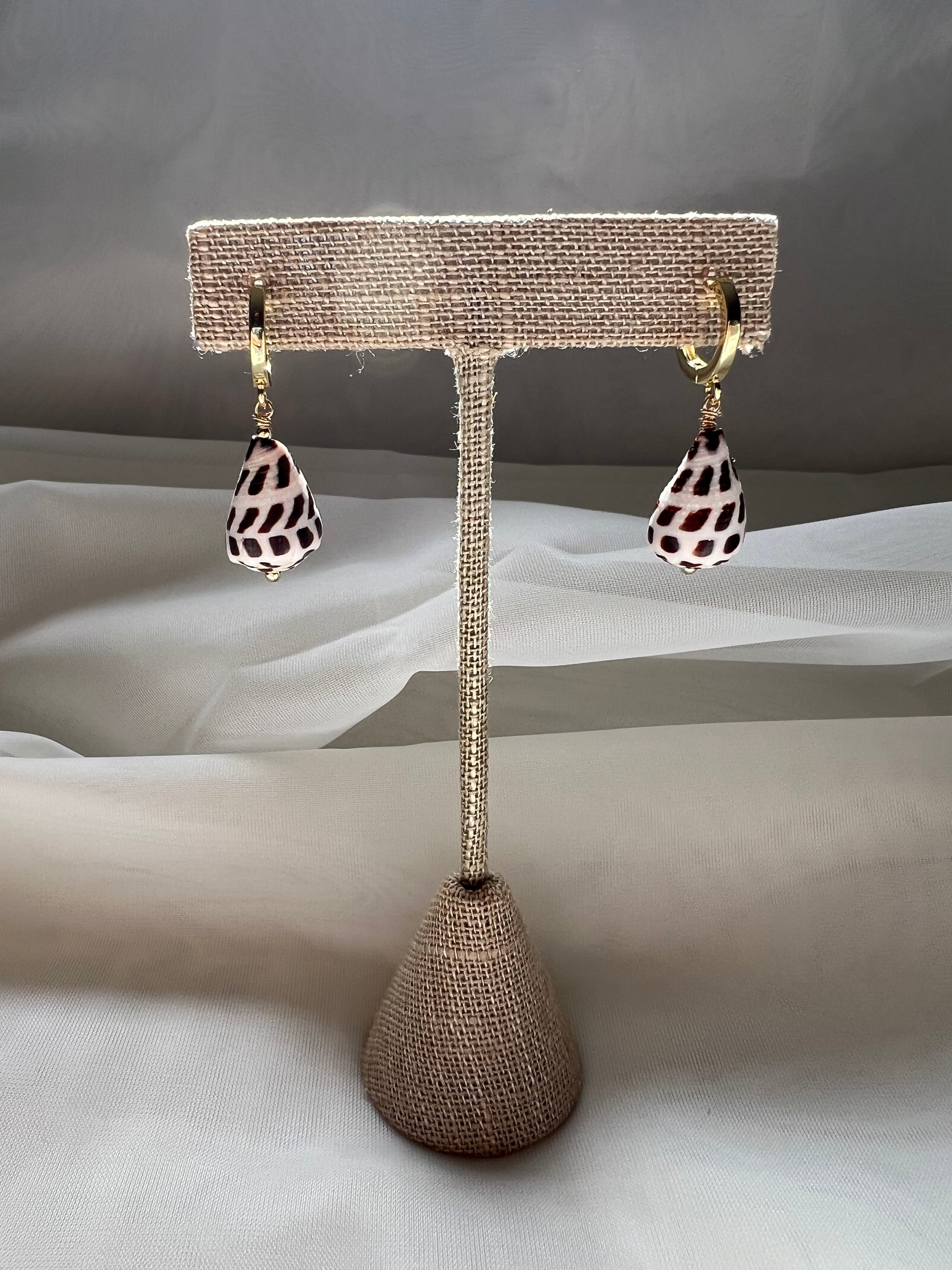 About 1/2”-3/4” Hebrew cone shells on 12mm gold filled huggie hoops. Measures about 1” long.