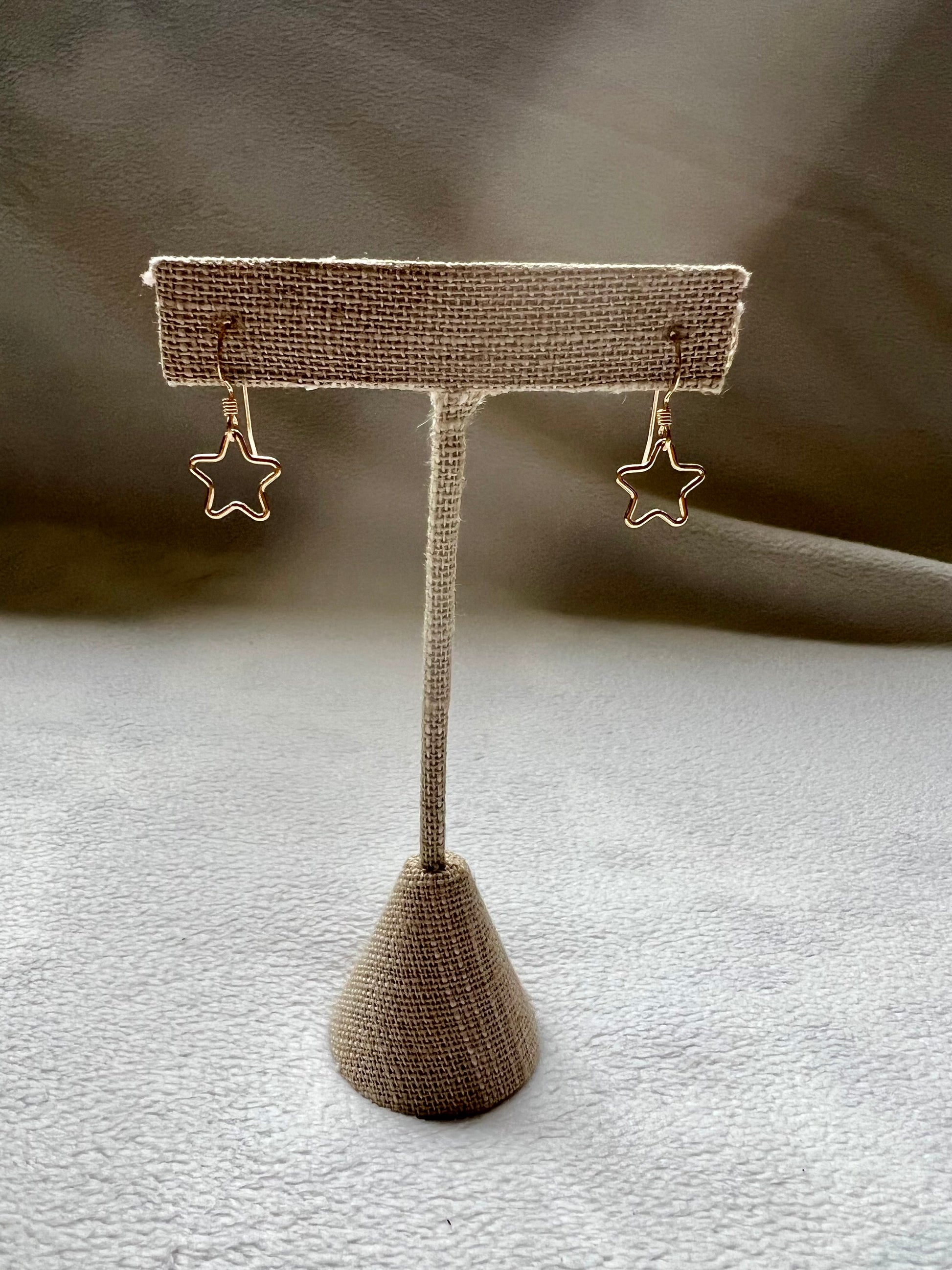11mm gold filled star on gold filled ear-wires. Measures about 1” long.