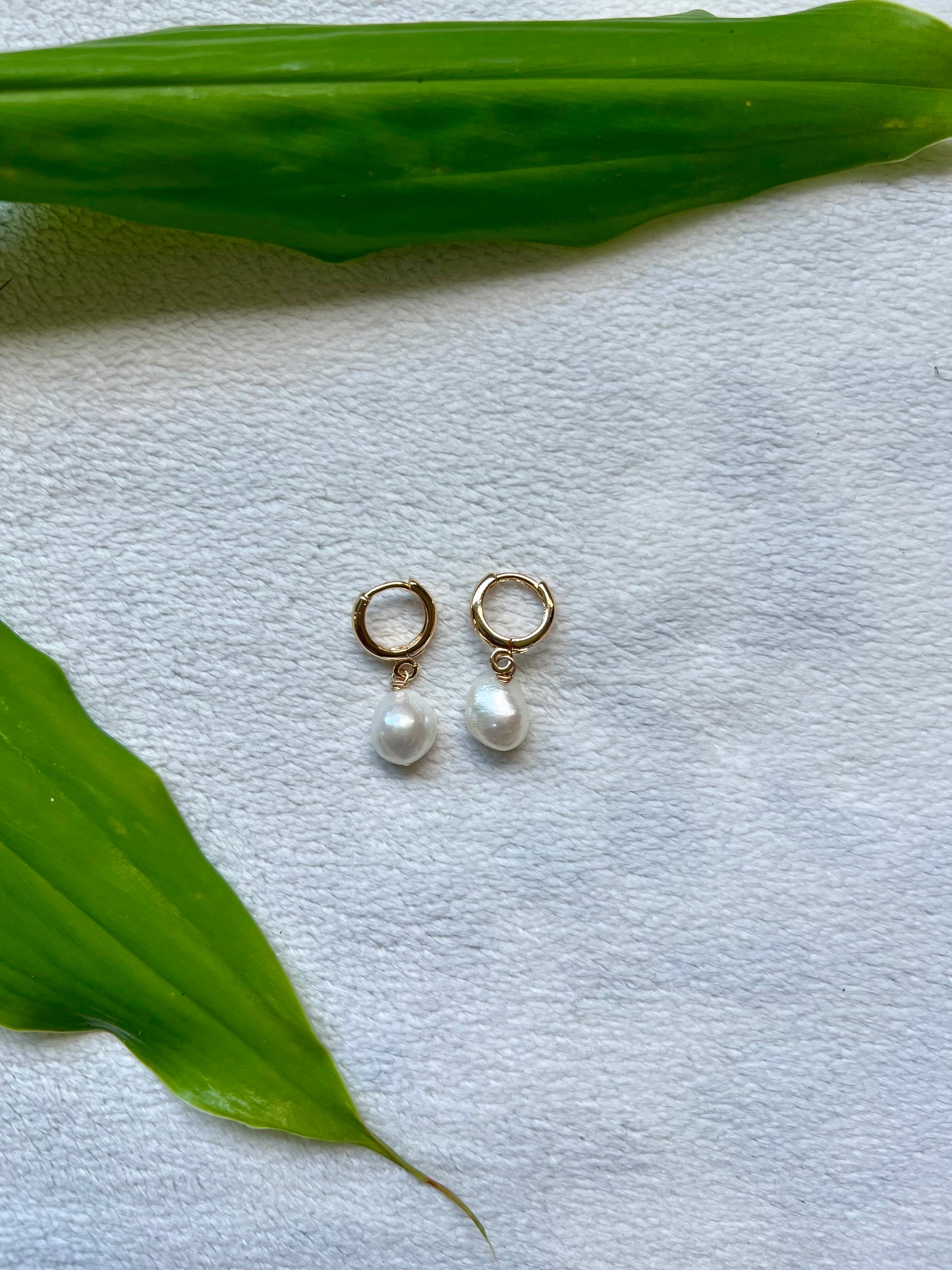 About 9mm white fresh water pearls on 12mm gold filled huggies. Measures about 1” long.