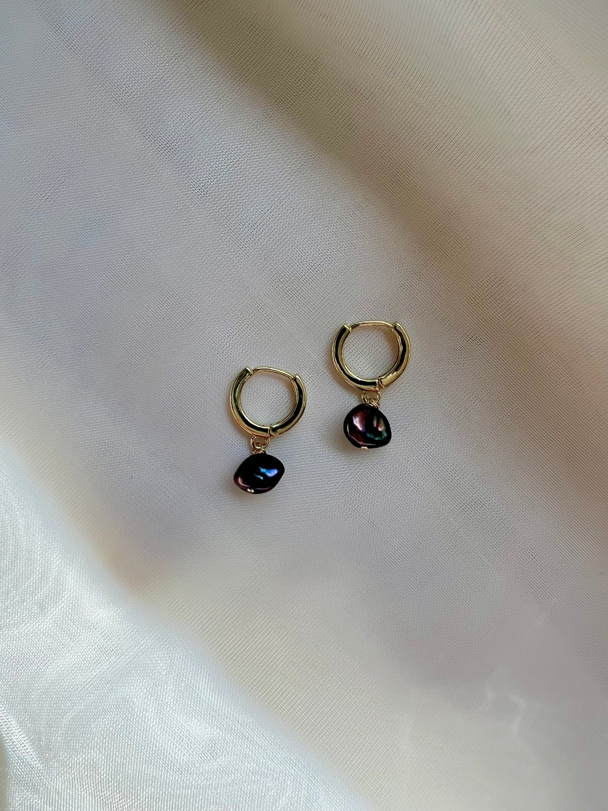 Fresh water black Keshi pearls on 12mm gold filled huggie hoops. Gold filled wire and findings. Measures about 1” long.