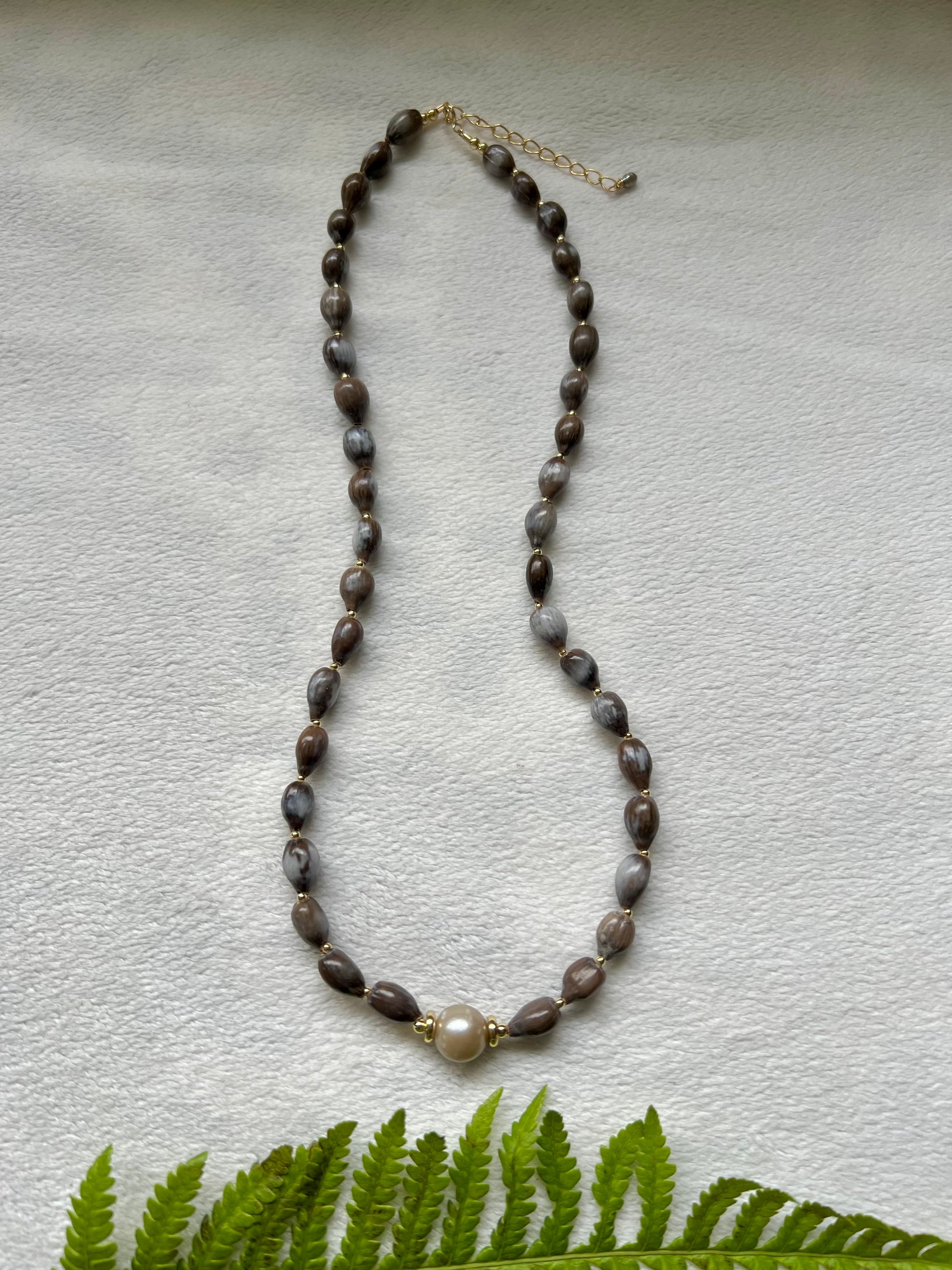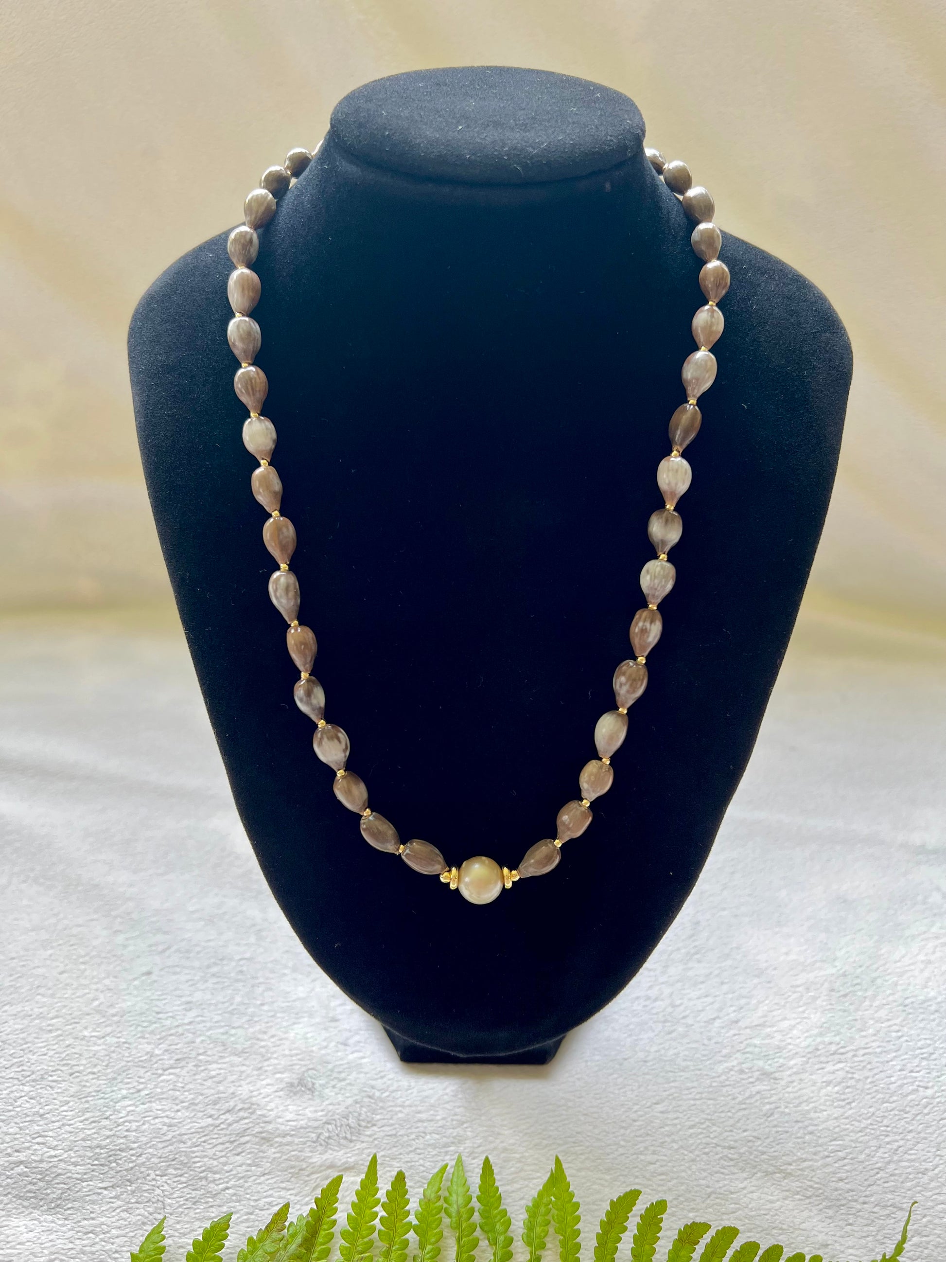 About a 10mm Tahitian Pearl, Job’s Tears and gold filled accent beads. Gold filled findings. Measures 19” long and comes with a 2” extension chain.