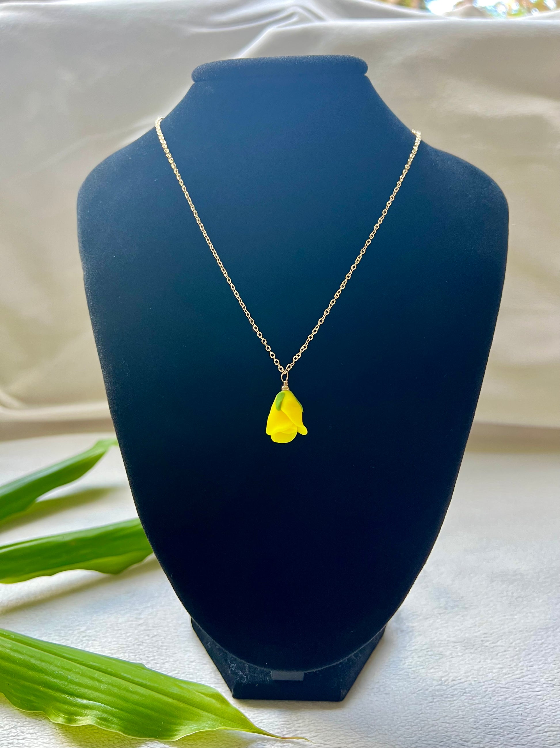 In collaboration with Designs by Momi, featuring a polymer clay yellow Lokelani (rose) pendant on a gold filled cable chain. Each necklace comes with a 2” extension chain. Lokelani bead is about 13mm x 11mm in size.