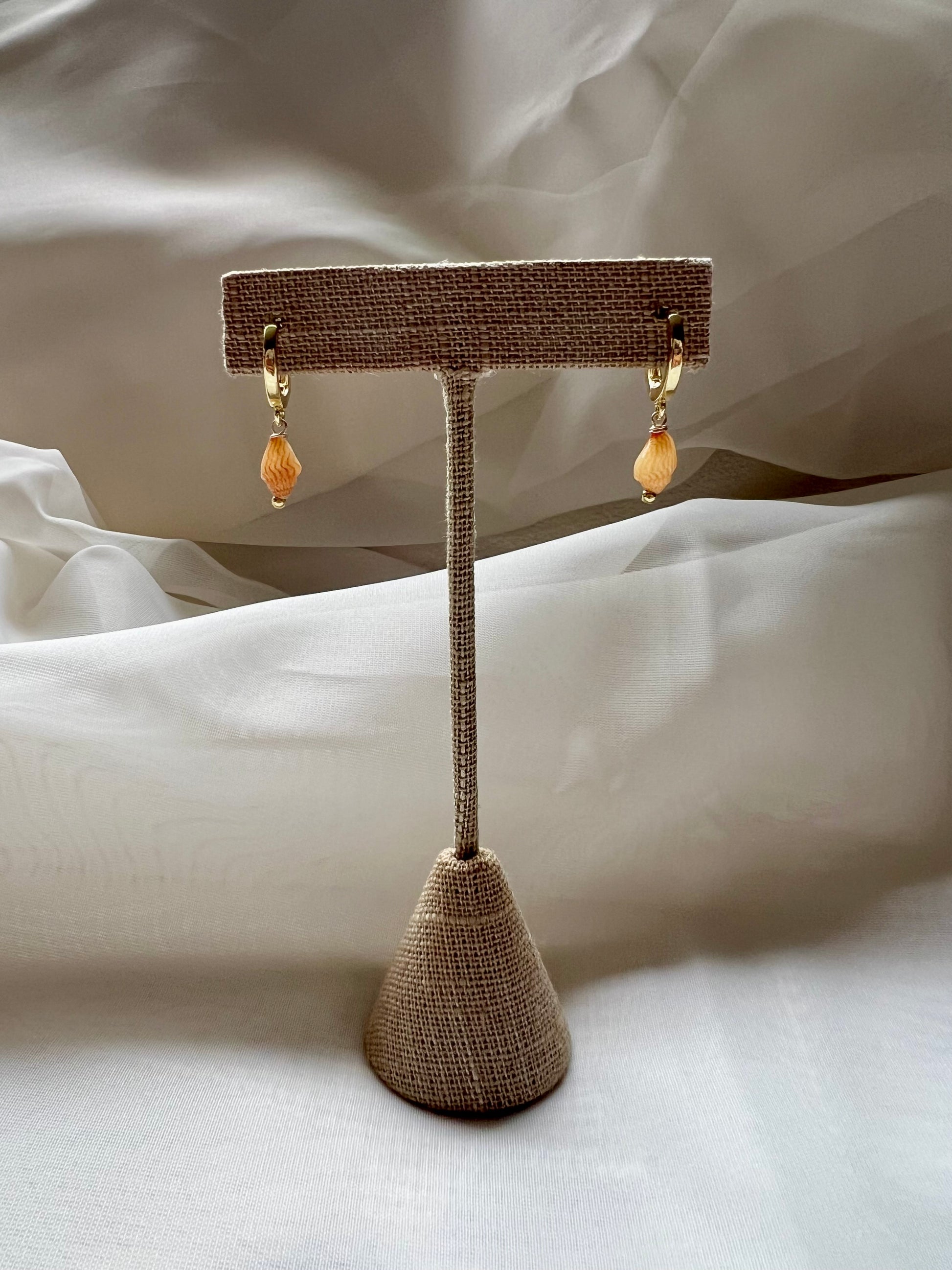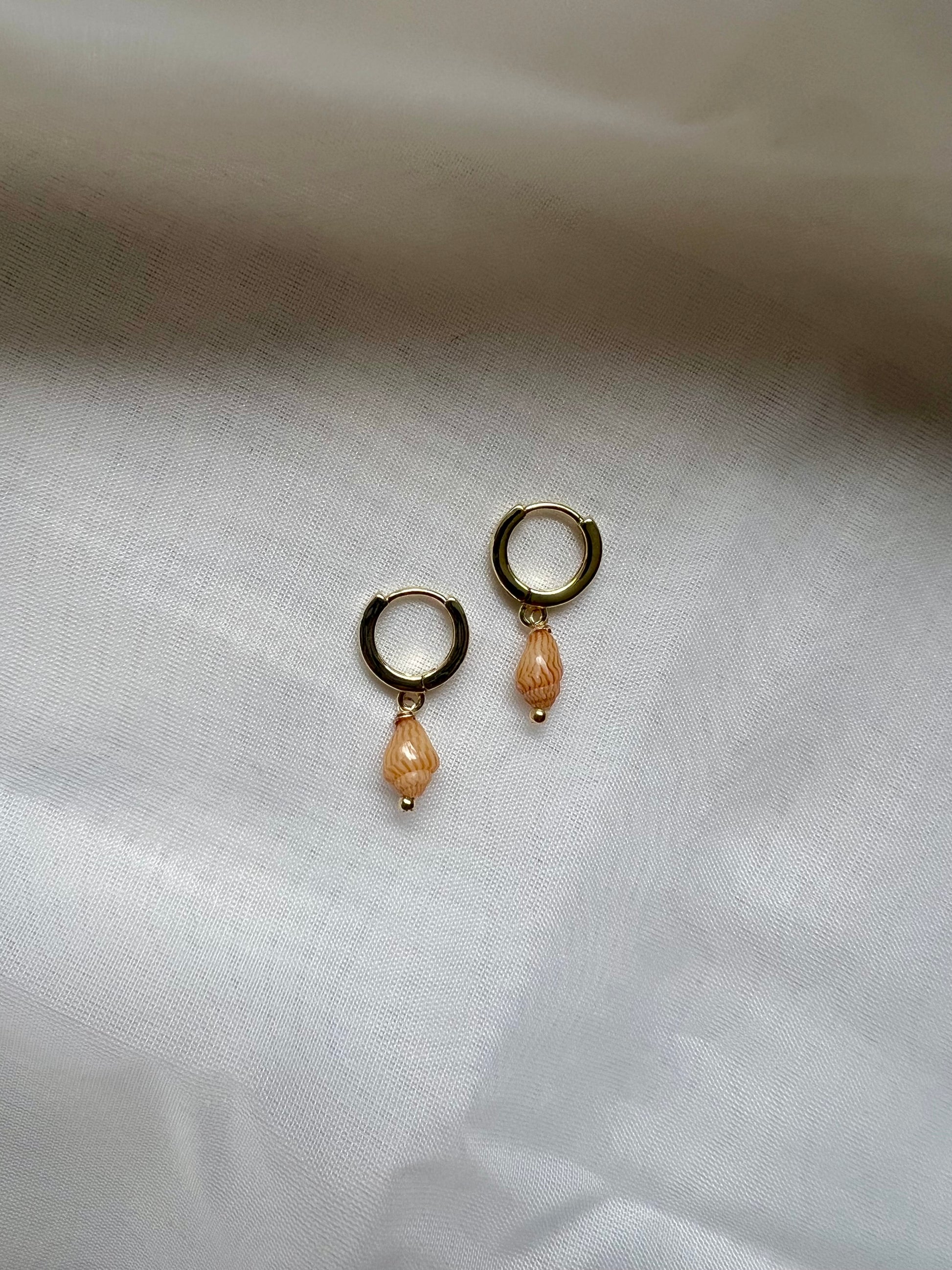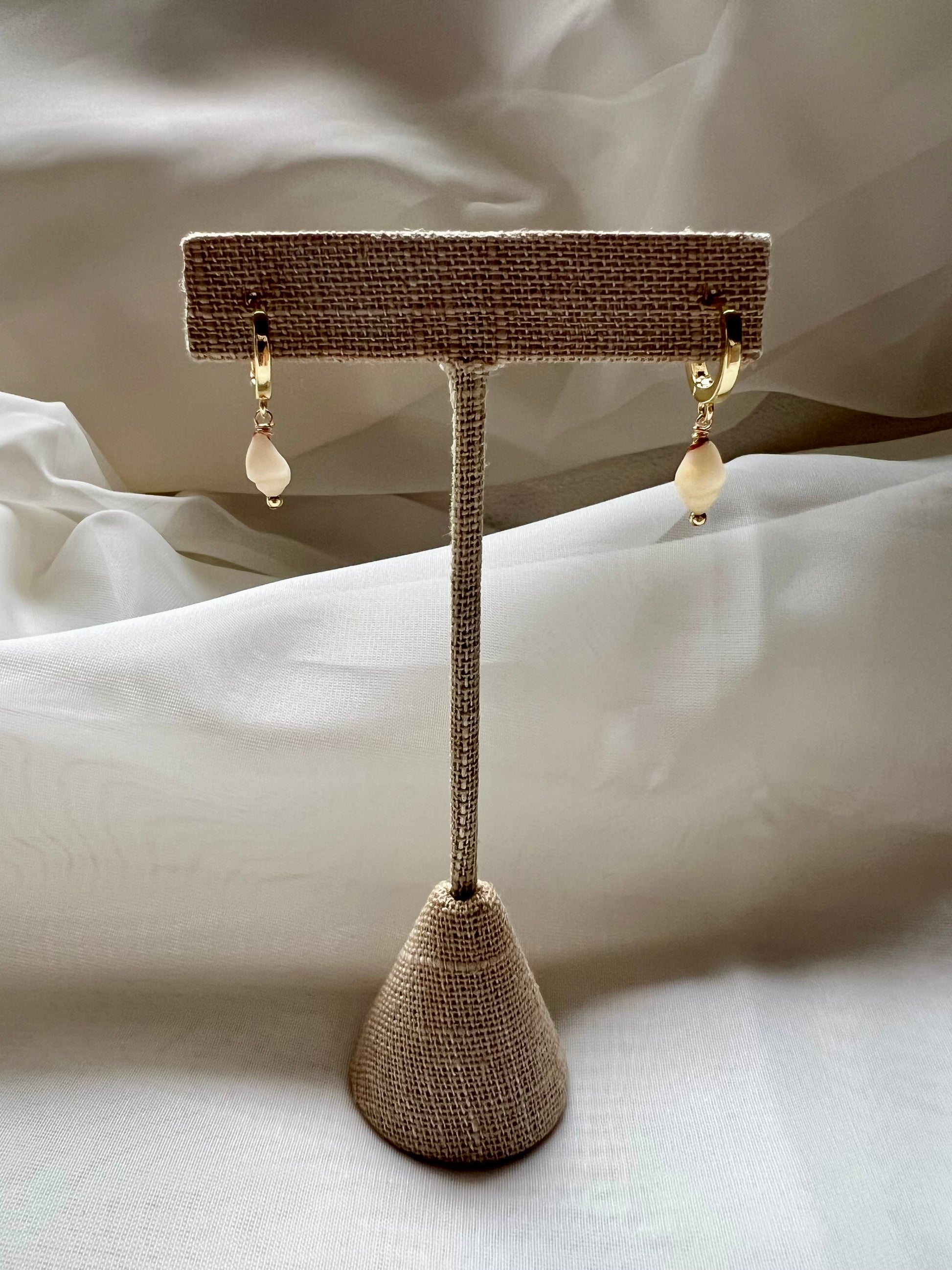 Momi shells on 12mm gold filled huggie hoops. Measures about 1” long. Shells may vary slightly in color and size than the one pictured.