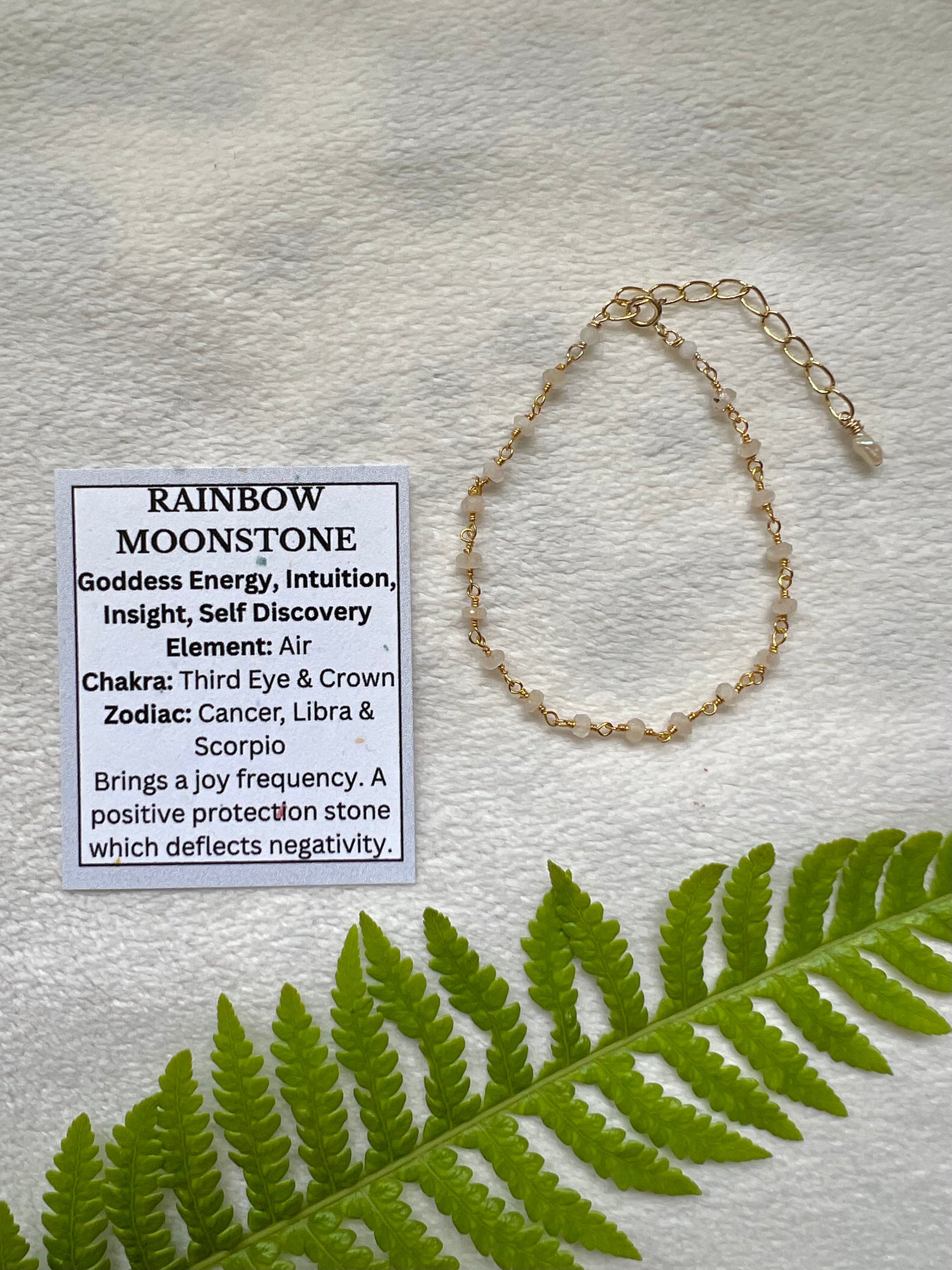A Dainty gold plated wire wrapped Rainbow Moonstone rosary chain bracelet. Gold filled findings. Measures 6.5” and comes with a 1.5” extension chain.
