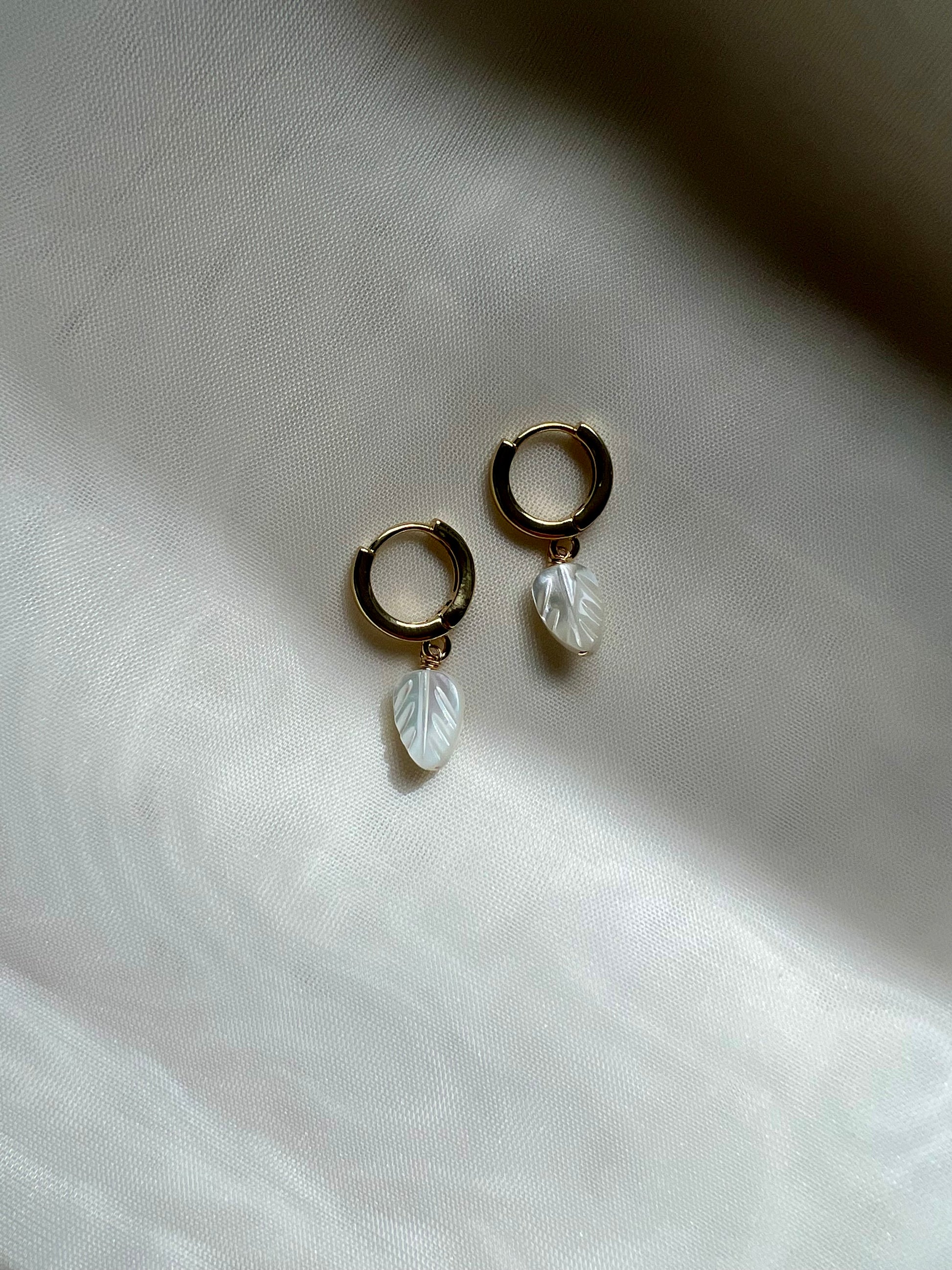 6x9mm hand carved Mother or Pearl leaf beads on 12mm gold filled huggie hoops. Gold filled wire and findings. Measures about 1” long.