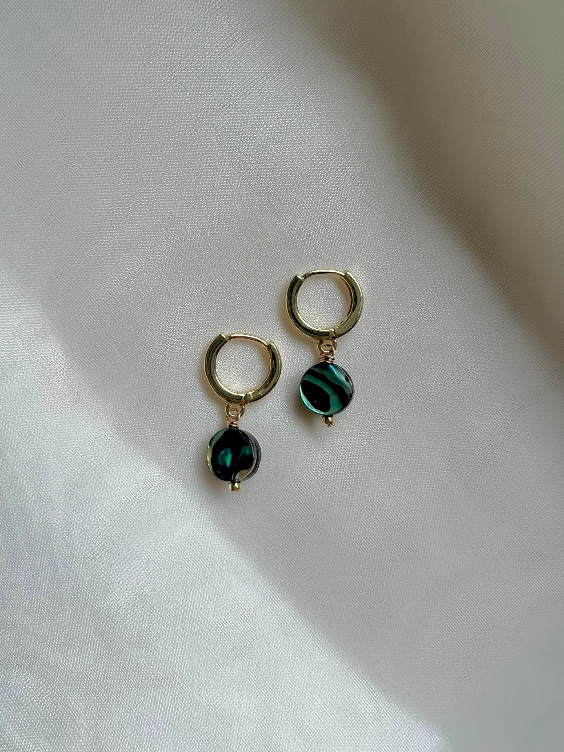 8mm Pāua (Abalone shell) mini moon on 12mm gold filled huggie hoops. Gold filled wire and findings. Measures about 1” long.