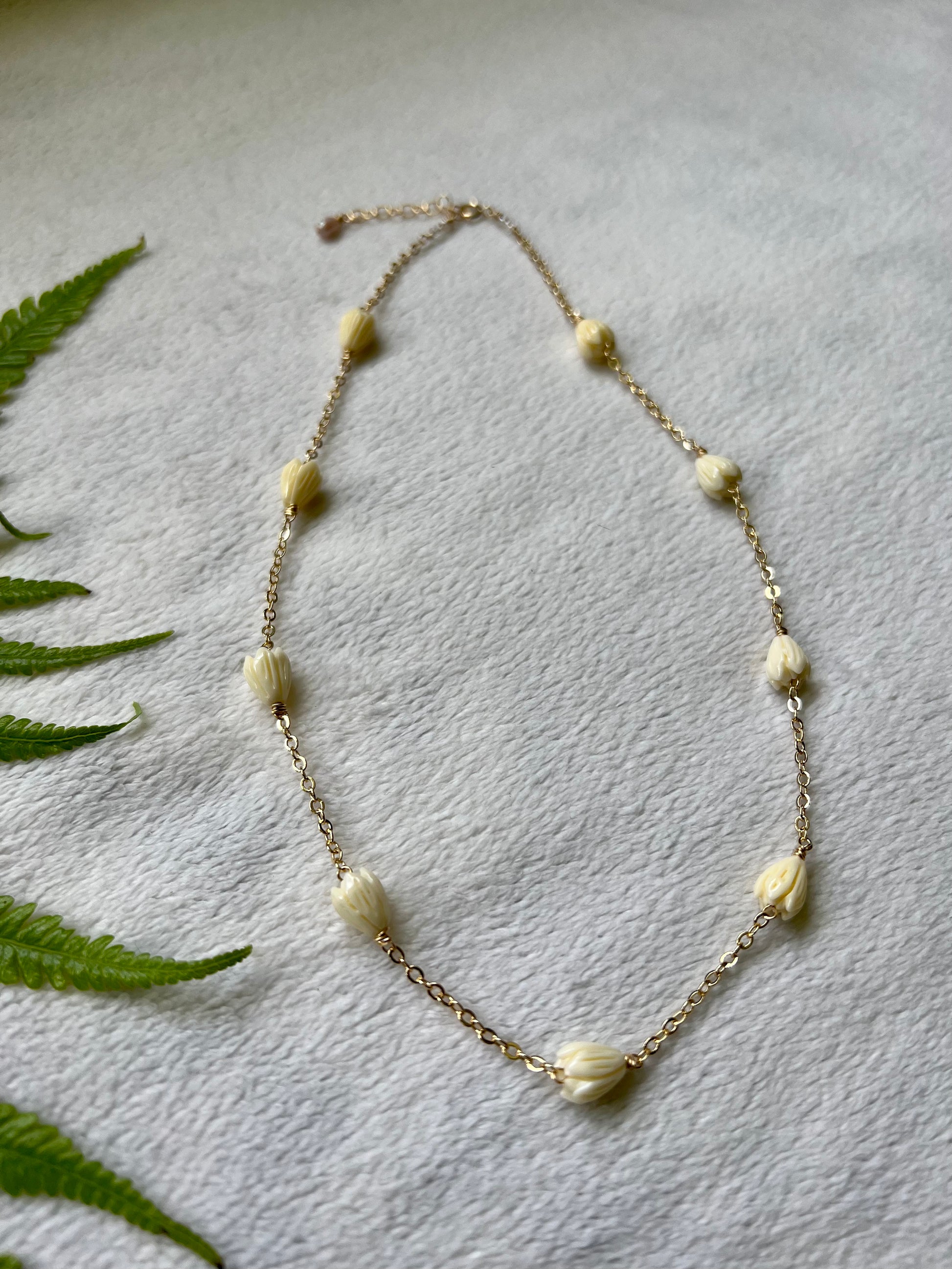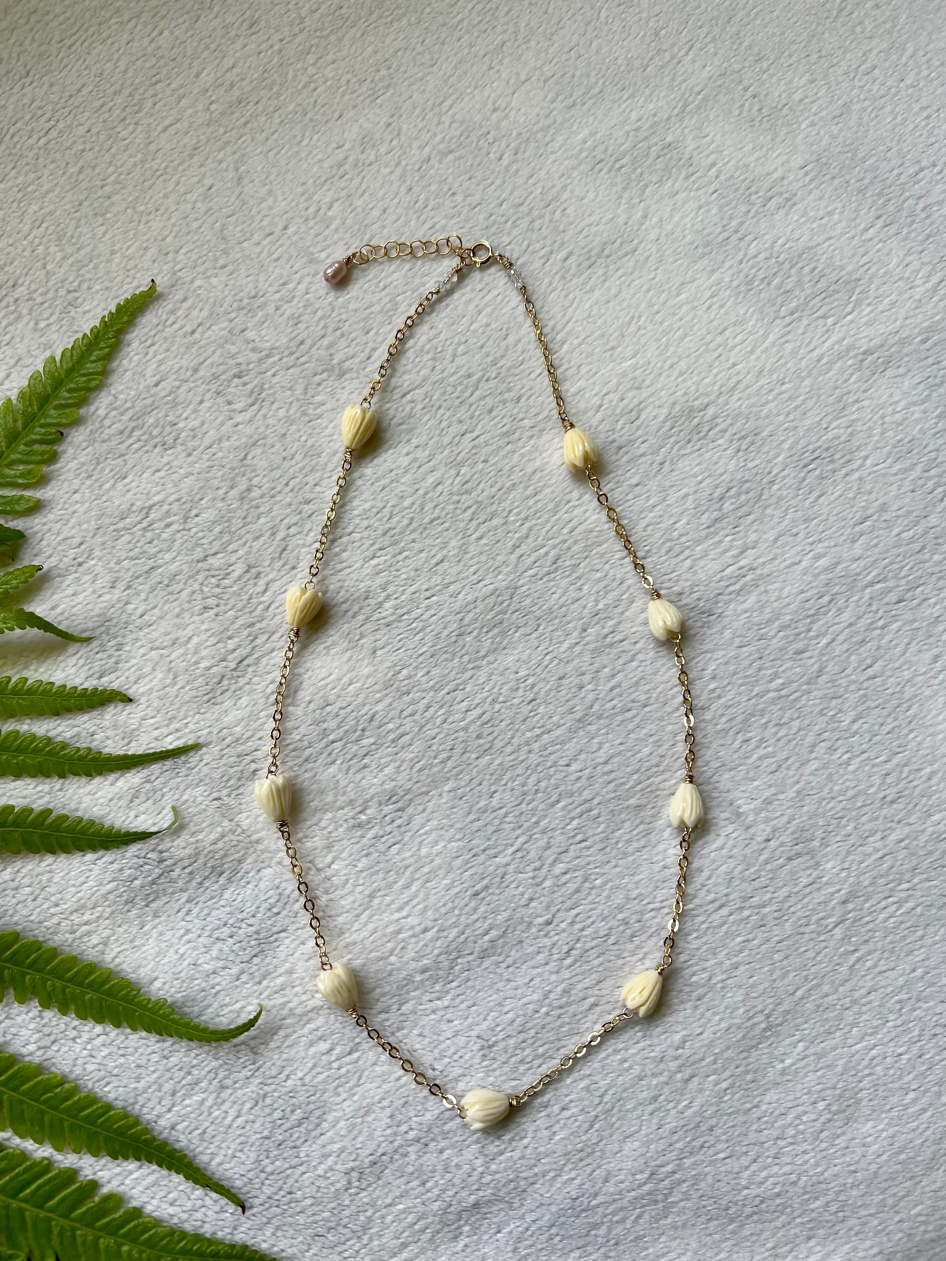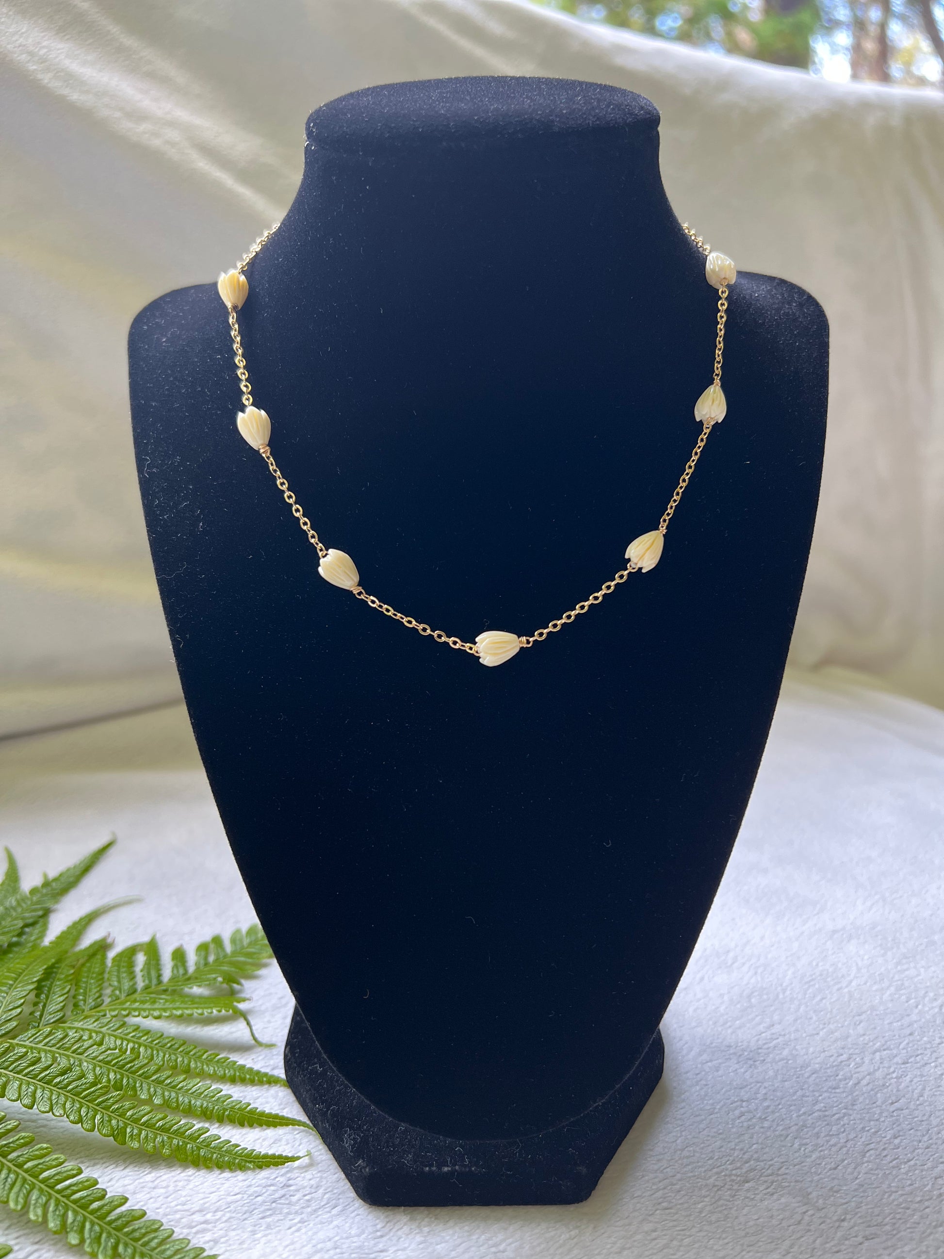 7mm hand carved resin Pīkake beads on a gold filled cable chain. Gold filled wire and findings. Measures 16” with a 1.5” extension chain.