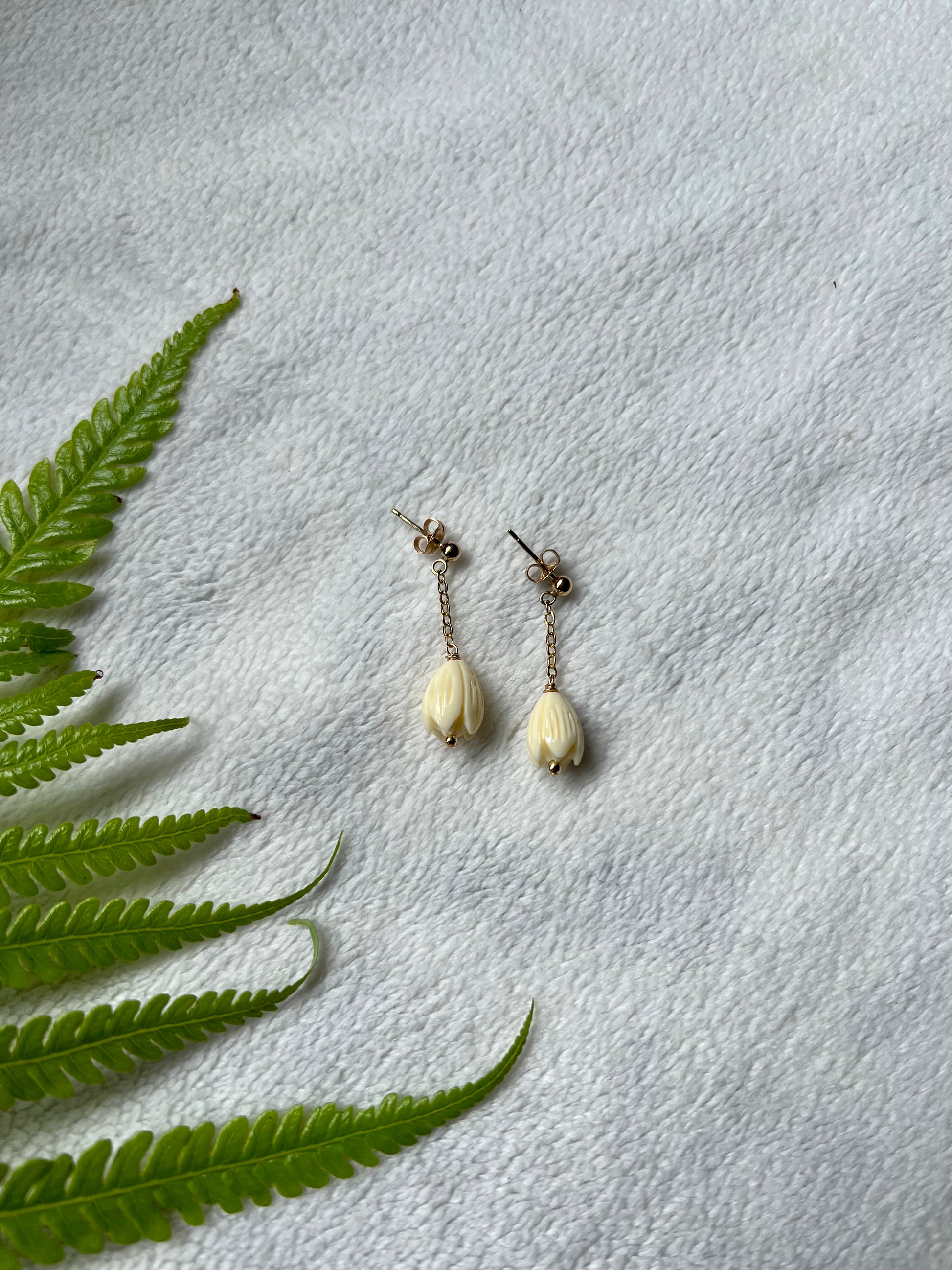 8mm hand carved resin Pīkake beads with gold filled chain on gold filled studs. Gold filled wire and findings. Measures about 1” long.