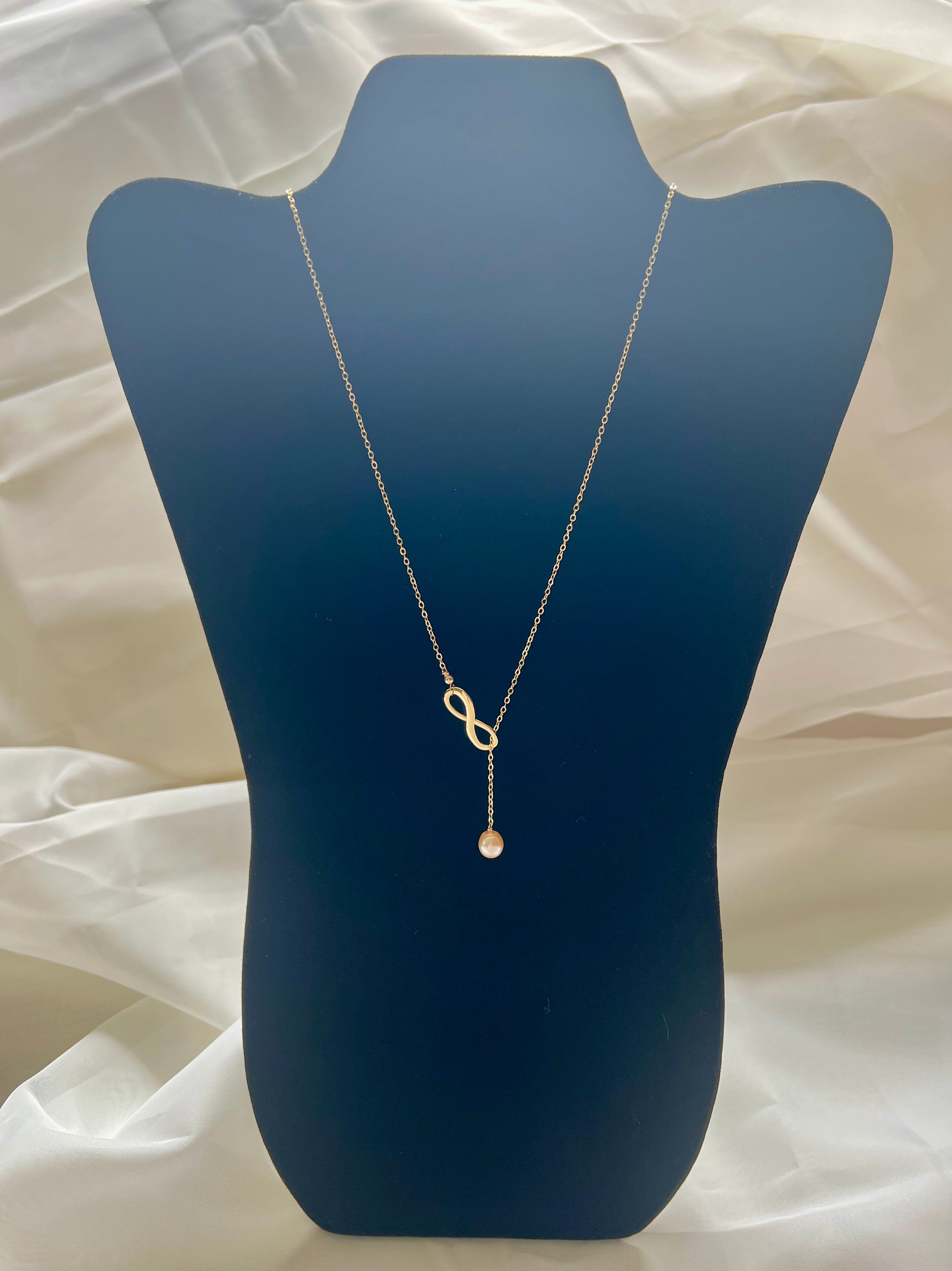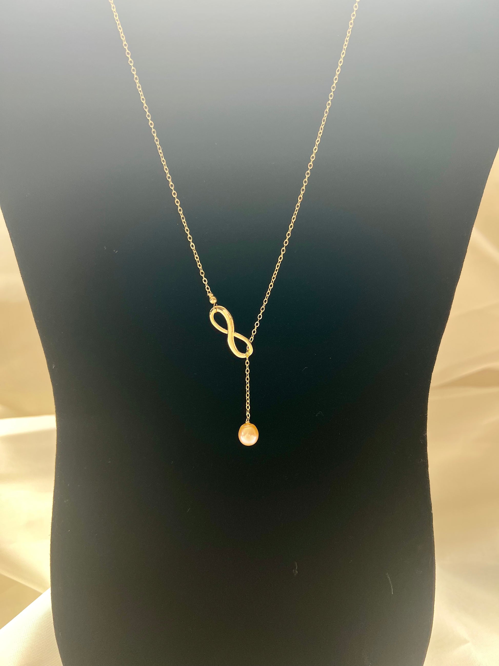 7-8mm pink Edison pearl and a gold filled infinity symbol on a gold filled cable chain. Gold filled wire and findings. Measures 22” long.