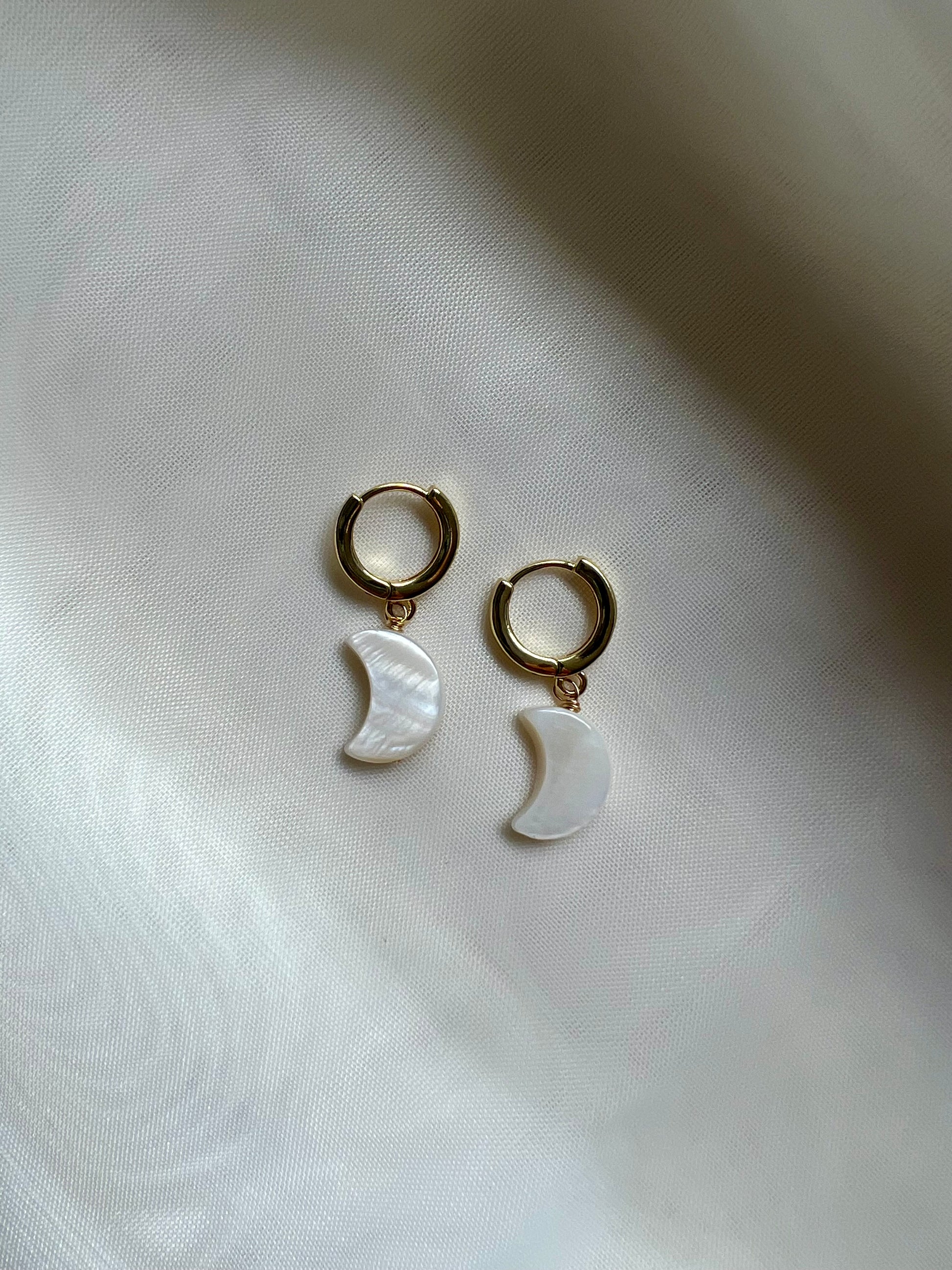7x11mm shell Moon beads on 12mm gold filled huggie hoops. Gold filled wire and findings. Measures about 1” long.